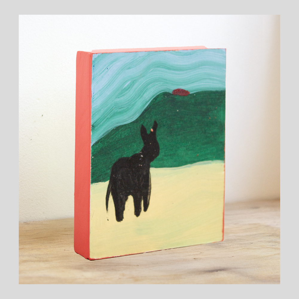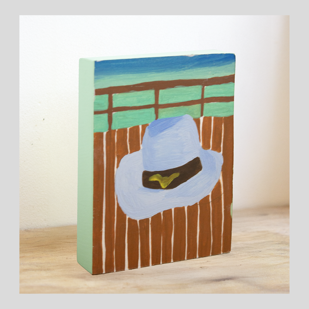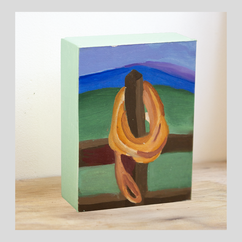 Depuis peu, il ouvre ce travail à des formats plus fragmentaires, plus aérés. Dans l’exposition Riverains (Quintal, 2025), il a présenté une série de dessins et de peintures flottantes, moins centrées sur l’objet, davantage portées par l’atmosphère. Ces formes évoquent un paysage mental ou intérieur, une narration implicite. Il y convoque des images inspirées du folklore américain, de la culture populaire et des codes vernaculaires, un univers discret, presque effacé, nourri notamment par Au bord d’une route vers Camp Meeker, carnet de voyage poétique et désaxé.